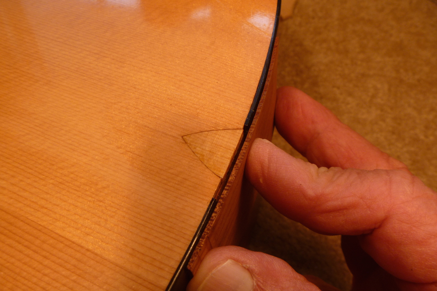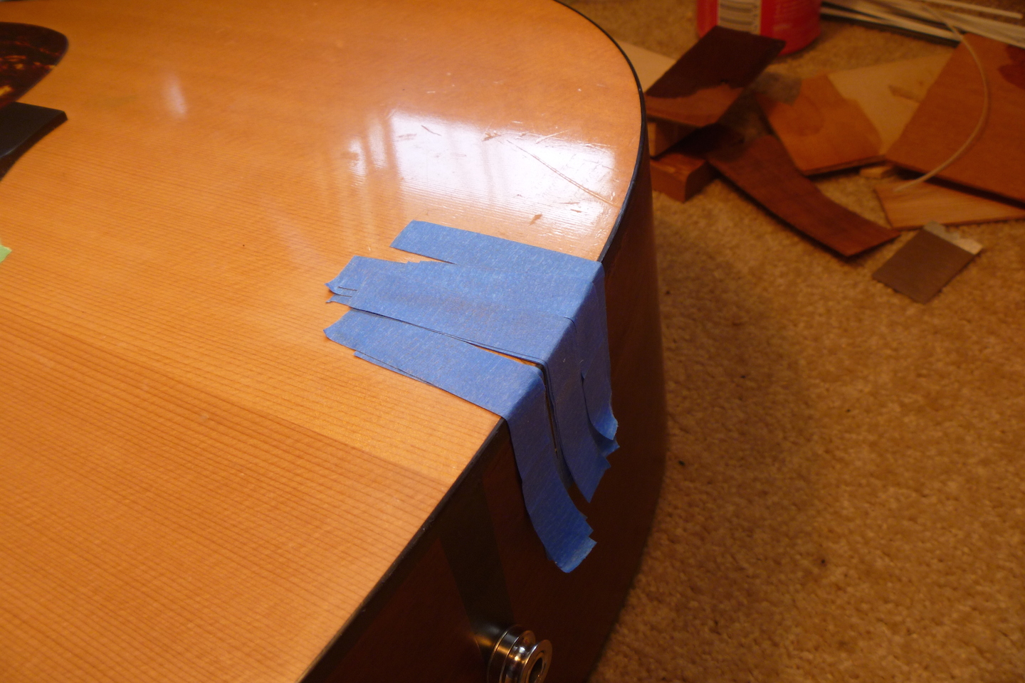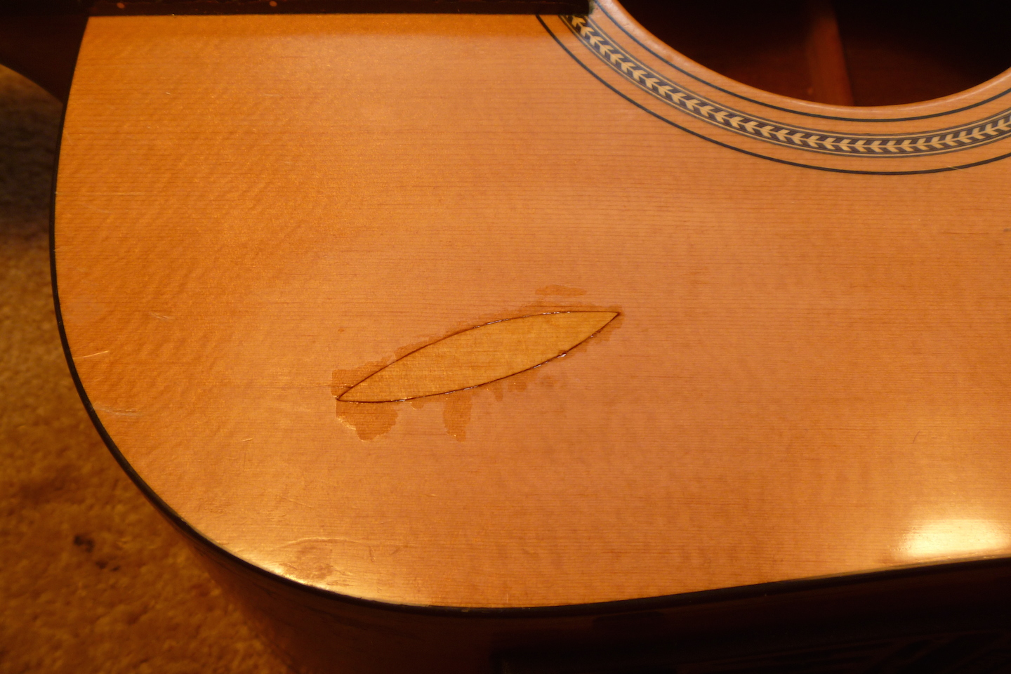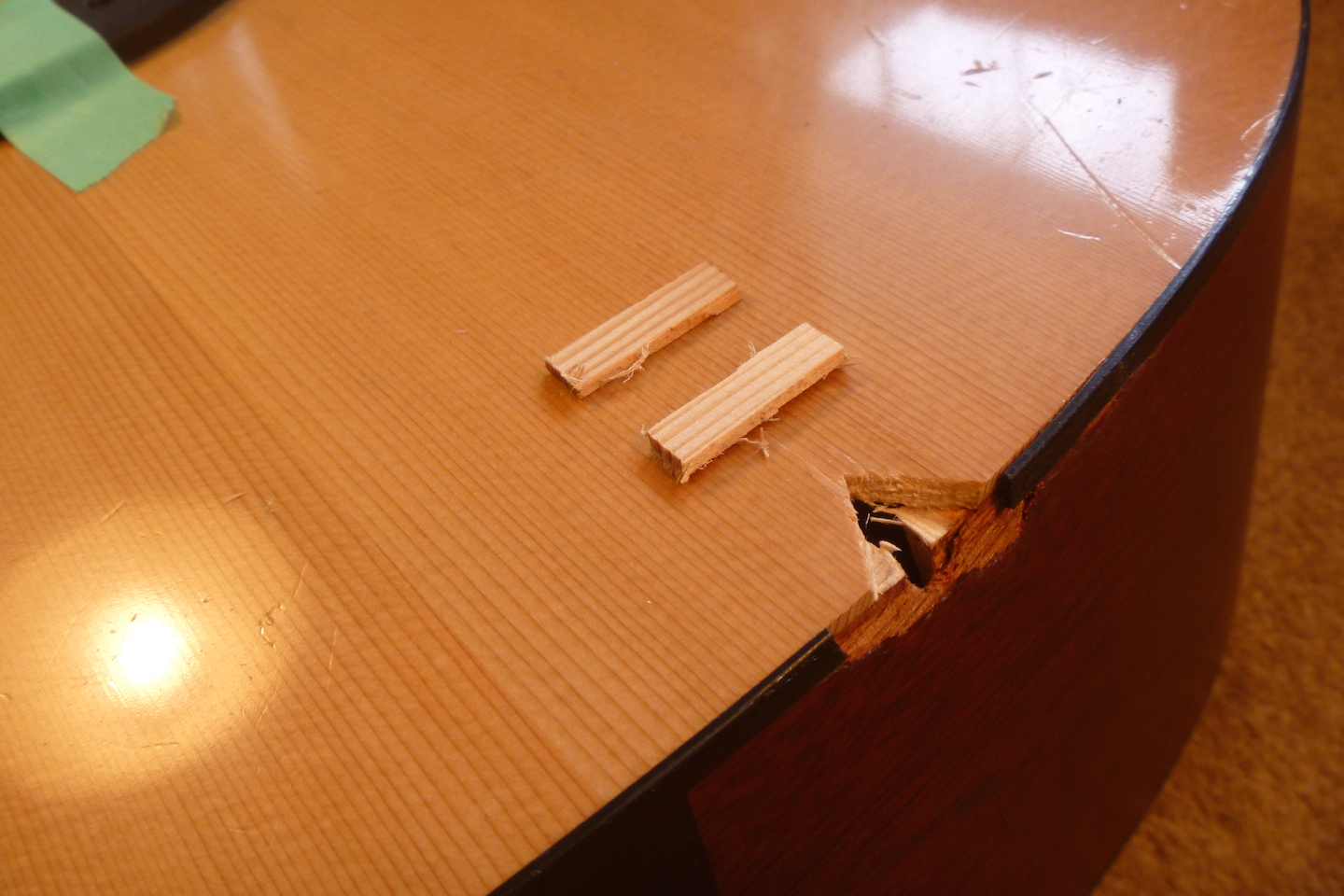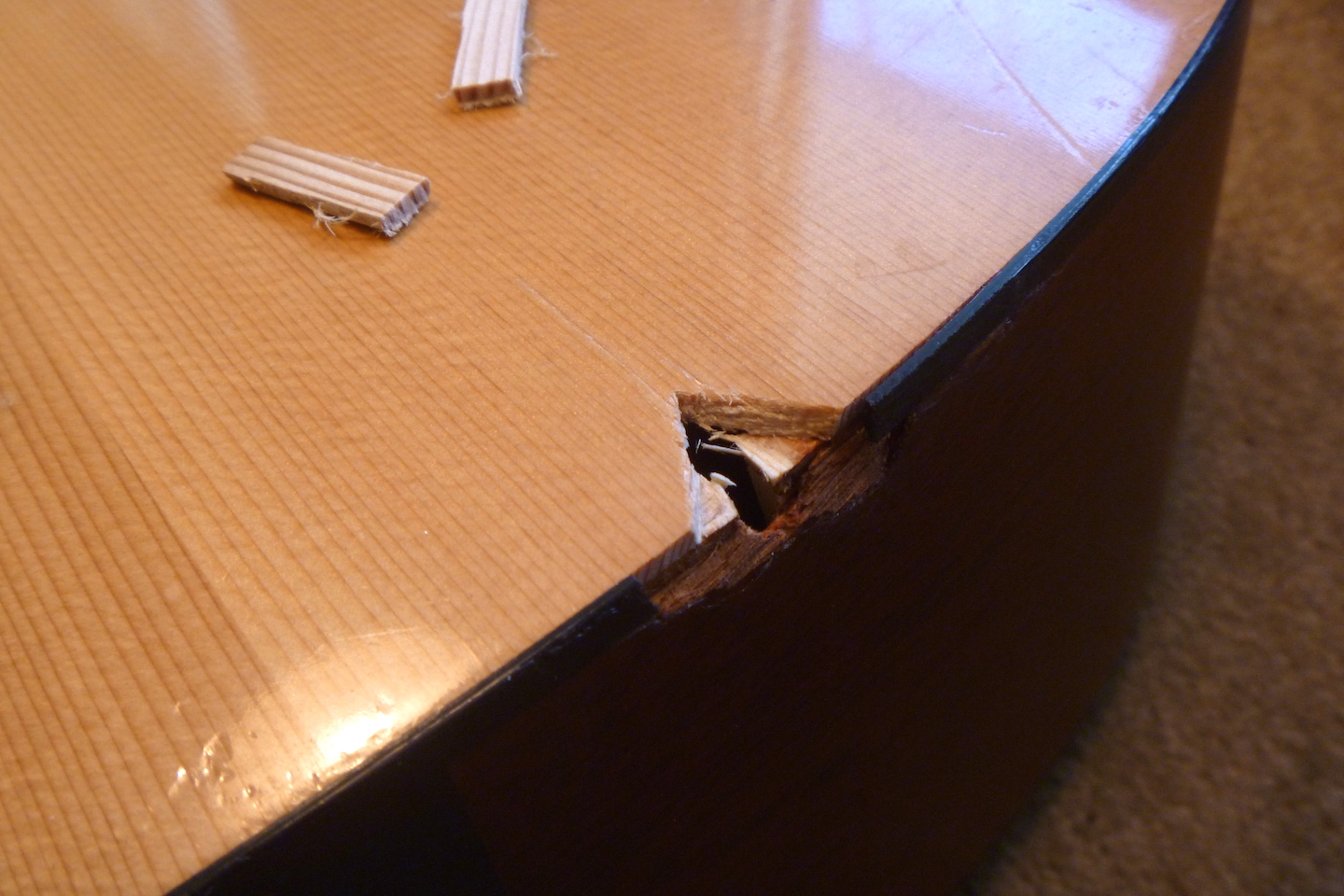 The guitar received crushing damage to the top and side and required replacing a section of binding. The photo essay that follows displays the repair process.