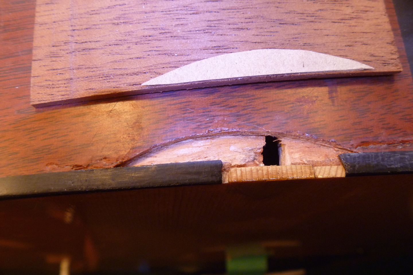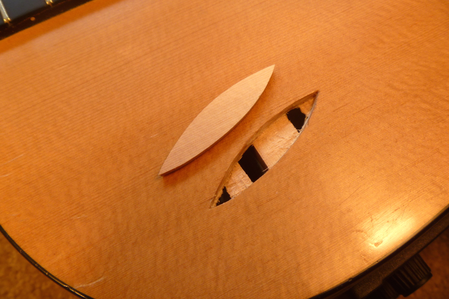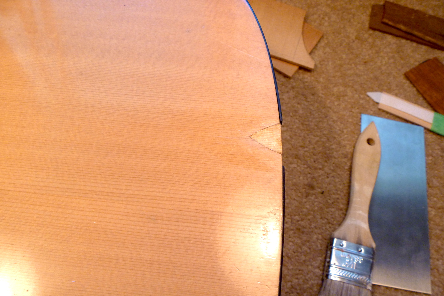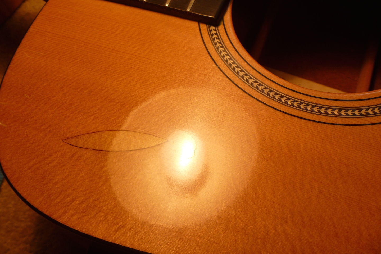The guitar received crushing damage to the top and side and required replacing a section of binding. The photo essay that follows displays the repair process.