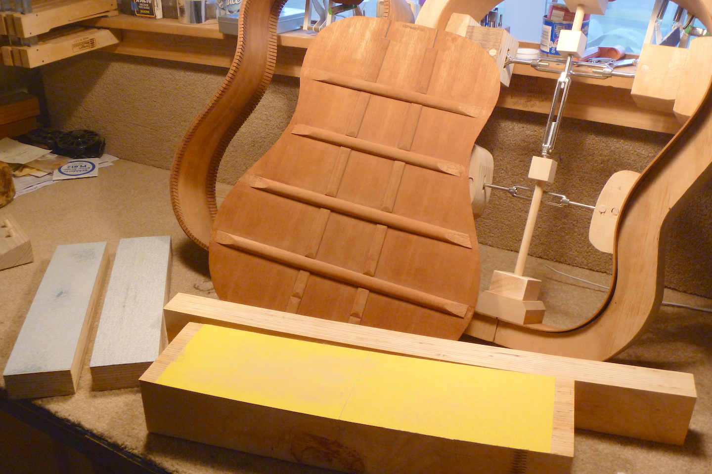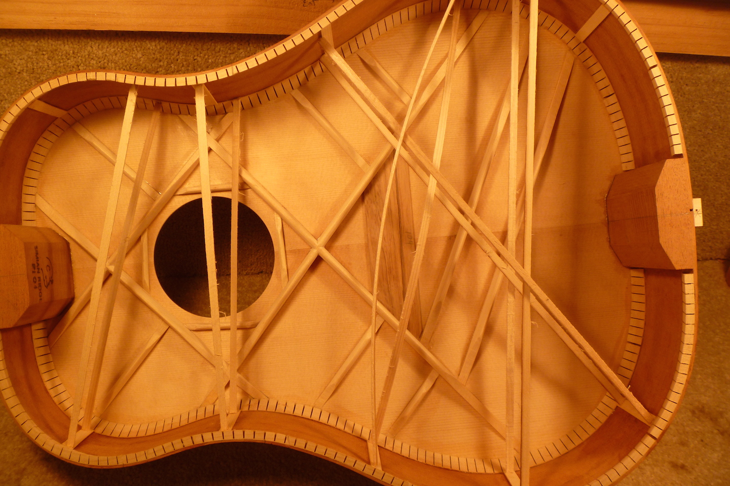 The Simian Ridge design employs mostly hot hide glue for assembly, neck attachment through compound dovetail joint, french polish shellac finishes, and a hybrid precision lapped double x soundboard bracing design which frames the soundhole for added strength, and turns the shoulders of the upper bout into effective soundboard.