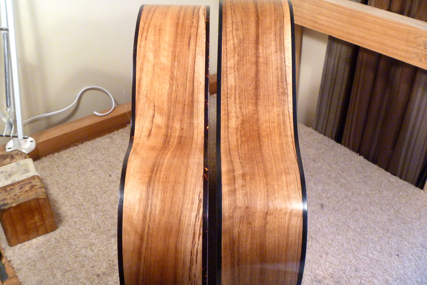 This scale length difference is fundamental to a few other differences. In order to get the bridge in the sweet spot with respect to the bracing (still double x as discussed in The Design), there needed to be 13 frets to the body. The body is a close copy of the 1920's Martin 000 made during the transitional years from gut strings to steel strings. And the bracing is quite light. Where the scale is about 5% shorter, the bracing is about 10% lighter. 000 main brades are 6.4mm (1/4 inch), dreadnought braces are 7mm. I held my breath when I tensioned up the first prototype, but the fear was unwarranted. The first SR 000 is now 3 years old and it is stable as can be.
