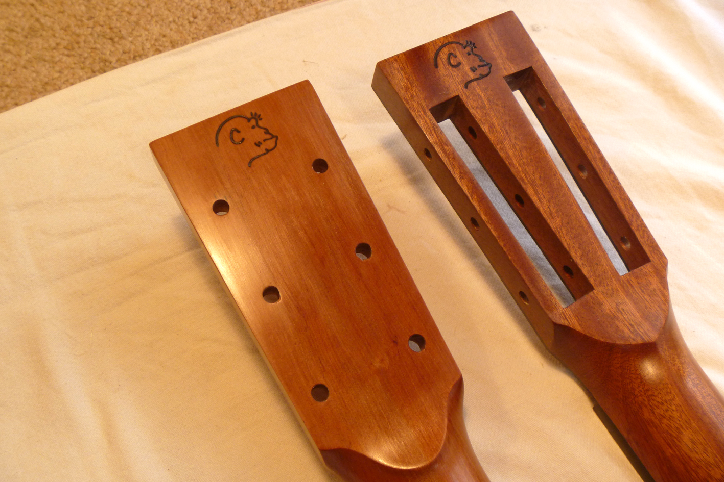 Both designs use pre-stressed graphite for neck reinforcement. Both guitars have french polished shellac as finishes. Both guitars wear the same ape's head logo with the exaggerated simian ridge.
