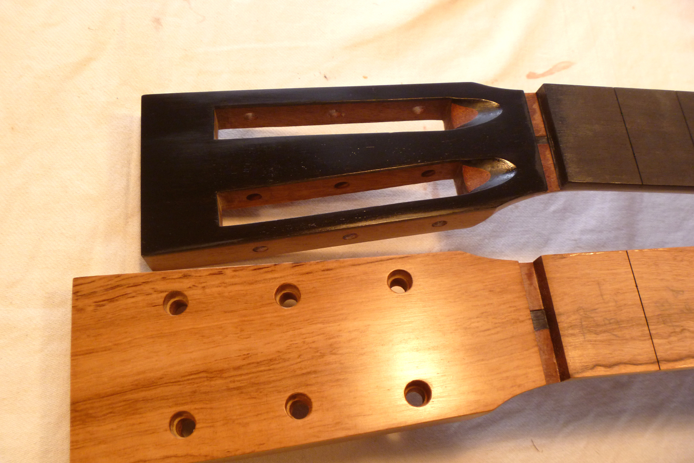 000 Neck above and Dreadnought neck below. Necks align at 12th fret to show major difference in scale length.